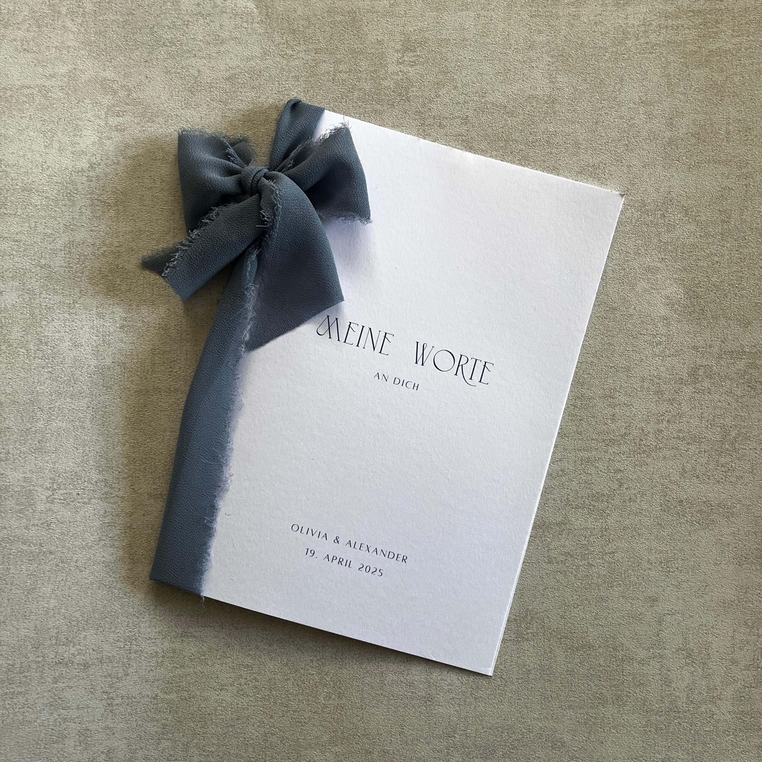 Haltet eure persönlichen Worte für immer fest mit unserem Ehegelübde Heft „Dusty Blue“– ideal, um eure Gelübde stilvoll aufzubewahren und immer wieder in die besonderen Emotionen eures Tages einzutauchen.