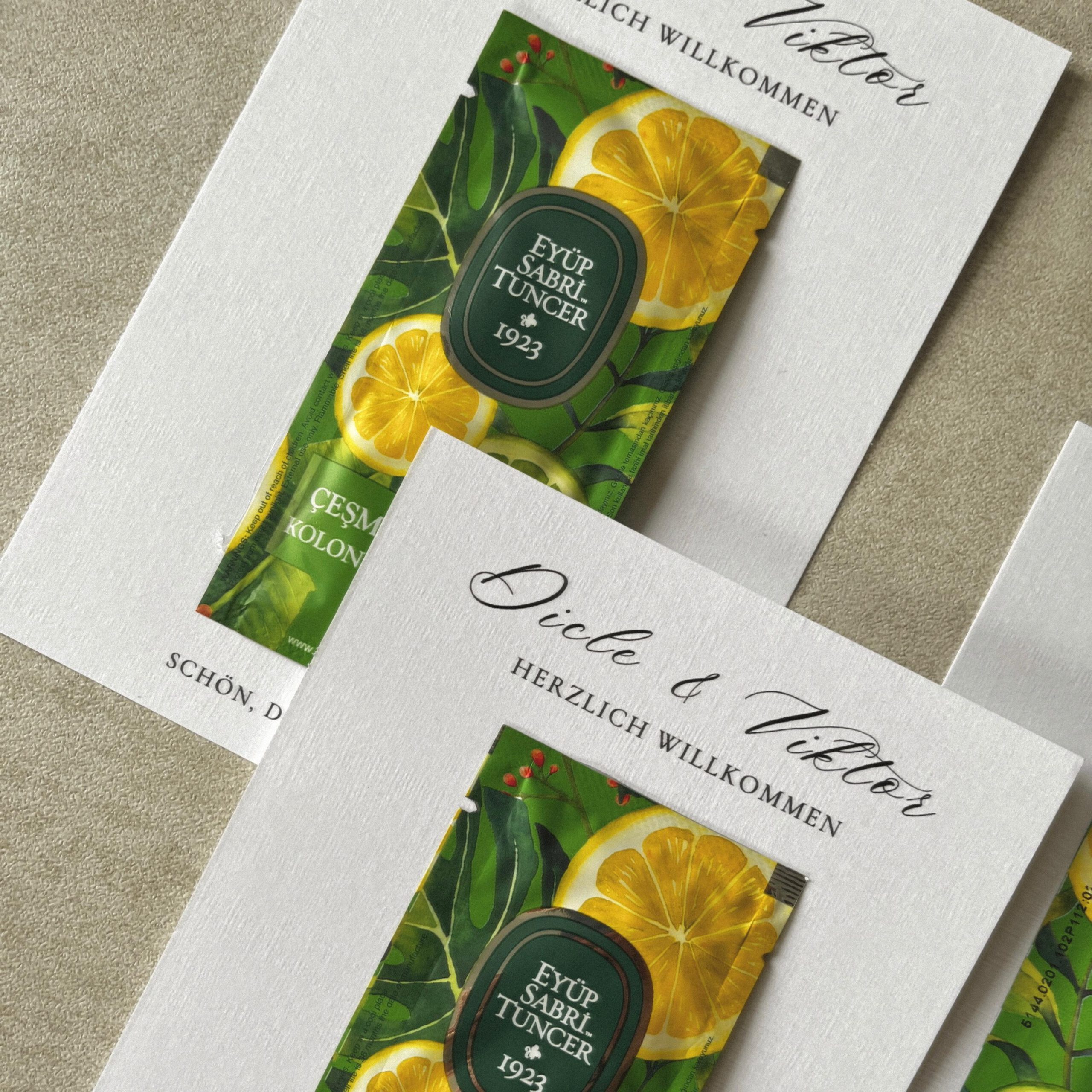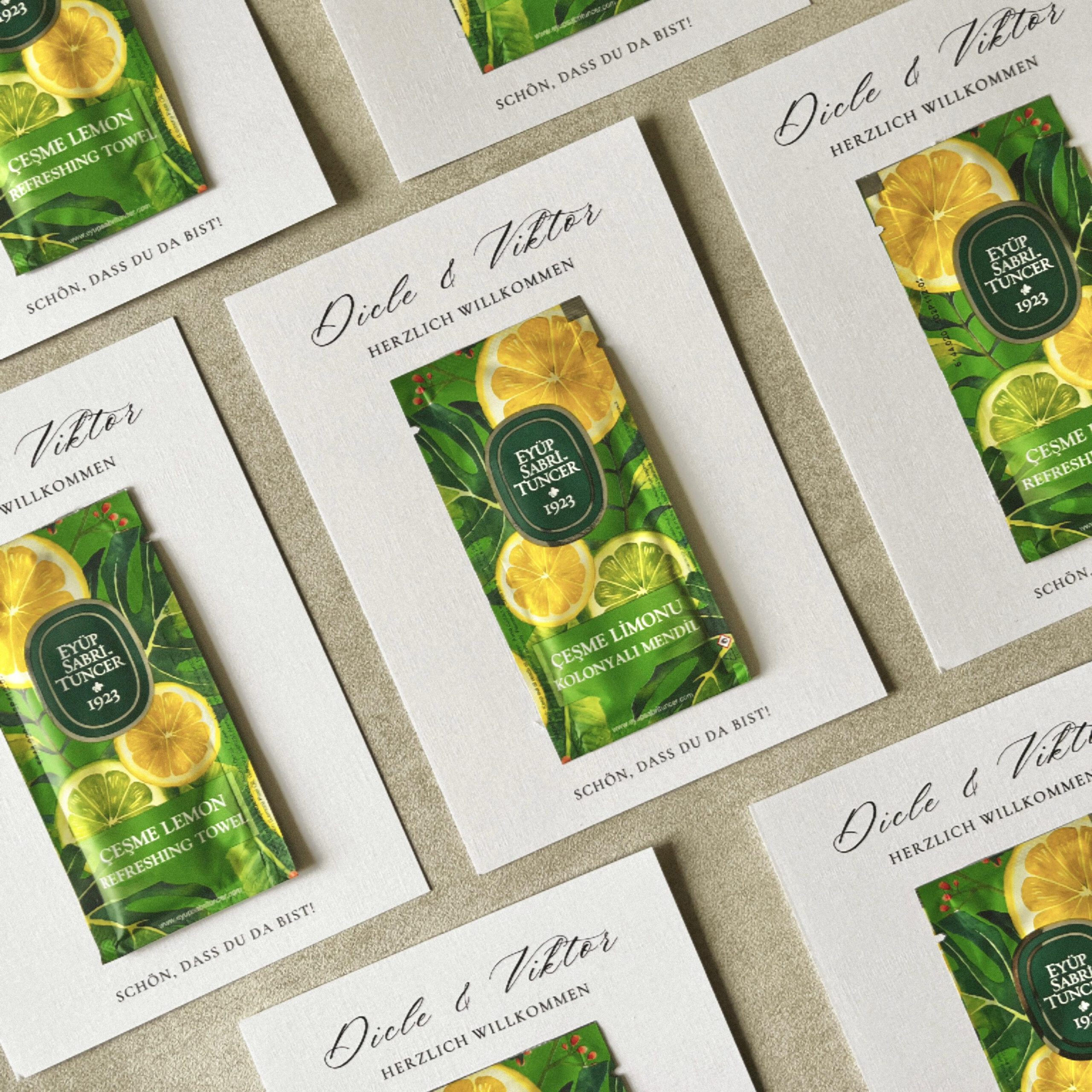 Das Erfrischungstuch ist stilvoll in die Karte integriert oder liebevoll befestigt – perfekt für Sommerhochzeiten, Taufen oder jede festliche Tafel.